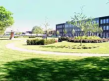 In 1955 plans were unveiled for new buildings to be added to the old Montrose Academy. Houses in the Academy Square were demolished and £250,000 set aside.[58] The 1961 extension, officially declared open on 23 October of that year, brought into use two three-storey blocks attached to the 1841 additions.[31] The major work of the last Extension in 1988-89 was the building of the East Wing, a two-storey block linked to the old West Wing by walkways.[59] It contains a number of teaching areas in addition to a Library, Communications Studio, Social Areas and Dining Room. In 2000, the 'Millenium Garden' was developed in the West Wing courtyard.[59]