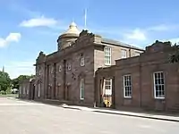 In the first quarter of the eighteenth century, an "English School" opened in the town. The school taught music, French, writing, arithmetic, book-keeping, geometry and navigation.[25] By the late eighteenth century, the old Grammar School was in ruins. Construction of the 'New Schools', designed by Andrew Barrie, commenced in 1787 and was completed the following year.[26] The buildings were constructed on the Mid Links, an area of parkland in the town,[27] and contained separate accommodation for the Grammar School, English School and Writing School.[28] Between the ruin of the old Grammar School and the building of the 'New Schools', the Grammar School operated from rooms in the Town House.[28]
