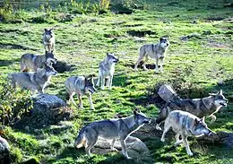 European grey wolves[9] historically populated the forests of Creuse, but the last one died in 1937.[10][11] Now wolves inhabit the Chabrières forest again: 23 European grey wolves live in semi-freedom inside two forested enclosures covering a combined area of 11,000 m2 (120,000 sq ft). During the last years, the park extended the variety of wolves types, and smaller packs of ice white Mackenzie wolves,[12] black Mackenzie wolves and white arctic wolves have been added to the population of the European grey wolves, the type most represented in the park.[2]