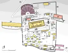 The Monument of Aemilius Paullus was erected in the Sanctuary of Apollo at Delphi shortly after 167 BCE in order to commemorate the Roman victory over King Perseus of Macedon at the Battle of Pydna. The incomplete pillar was intended as a base for a portrait of King Perseus. It was originally created to establish the Macedonian presence in Delphi, and to remind the Delphians of the tradition of friendship existing between them and the royal family.[1] However, the monument was taken over by Aemilius Paullus to celebrate himself and Rome's victory noting that, "it was only proper that the conquered should give way to the victors."[2] The Monument of Aemilius Paullus stood in front of the Temple of Apollo along with two other commemorative pillars to Eumenes II of Pergamon and Prusias II of Bithynia.[3] However, this pillar dominates over the other two. The completed monument had a bronze equestrian statue that sat on top of a rectangular pillar over 9 meters high.[4] Although the bronze statue that originally sat atop the pillar no longer remains, the cuttings in the plinth show that the horse would have been in a rearing position. An inscription at the base of the pillar survived, L(ucius) Aimilius L(uci) f(ilius) inperator de rege Perse / Macedonibusque cepet, which translated, reads, "Lucius Aemelius, son of Lucius, Imperator, took it from King Perseus and the Macedonians."[5]