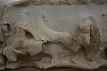 On one side of the frieze, a riderless horse appears dominating the scene. This alludes to the story that said the battle developed from pickets skirmishing over an escaped horse (or mule).[10] Legends said an oracle predicted that whichever side started the battle would lose. Before the battle, a Roman horse got loose and ran towards the opposition, which caused Perseus to assume the Romans had initiated battle. When he attacked in return, Perseus then started the battle himself.[8] For this reason, the riderless horse indicates that the relief specifically depicts the Battle of Pydna, opposed to some generic scene of combat between the Romans and Macedonians. Some suggest that each panel should be read as a different phase of the battle, from the initial skirmishing to the final rout. Taylor argues that the four reliefs together were intended to depict a single scene of Roman victory, and that the prominence of cavalry throughout alludes to the successful mounted pursuit of fleeing Macedonians after the phalanx had broken.[9]