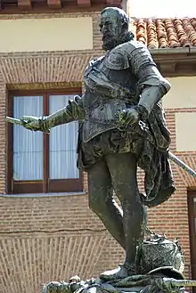 The Monument to Álvaro de Bazán is an instance of public art in Madrid, Spain. Located at the Plaza de la Villa, it consists of a bronze sculpture designed by Mariano Benlliure representing Álvaro de Bazán—a noted 16th century Admiral of the Spanish Navy once described by Cervantes as "father of soldiers, lightning of war, fortunate and never defeated captain"—[1] put on top of a stone pedestal.