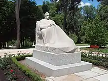 The sculpture represents Galdós towards the end of his life, sitting on an armchair (with arms in the form of lions), with his legs covered by a blanket.[2][3]