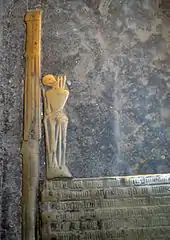 The monument's brass has a Latin inscription between the lost figure of Rudying and the Figure of Death, which is poised to strike Rudying with a spear.[6][7] The brass is "in the tradition of the memento mori in that, despite Rudying's self-proclaimed accomplishments, Death points out that all men come to the same end." It is perhaps an indication of Rudying's modesty that, despite his many achievements, he chose to put such a memorial on his tomb.[1]