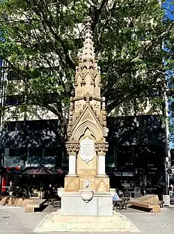 This highly decorative drinking fountain stands on a triangular piece of land at the junction of Queen and Eagle Streets. The foundation and steps are 3.9 metres (13 ft) square and built of porphyry (Brisbane tuff). The base is 2.1 metres (6 ft 11 in) square and built of granite from Mount Alexander in Victoria.[1]