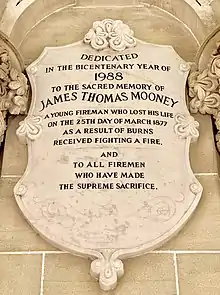 When the Eagle Street fountain was restored in 1988, a special tablet was inscribed as a dedication to James Mooney and to other firemen who had lost their lives in the line of duty.[1]