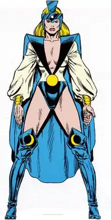 Later, during the Nth Man's attack (who tried to consume the Squadron's universe) she tried to re-join the team. Because she'd had a child just a week previously, Arcanna was forbidden by Power Princess to go; so using her own illusionary abilities, she assumed the guise of Moonglow. With the Squadron, she attempted to save her universe from the Nth Man; however in the process, her son became the new Nth Man, exchanging minds with Thomas Lightner.[5]