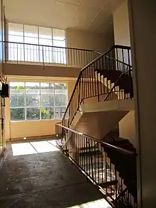 The west end section has lavatories to ground floor, and open meeting spaces (former cloak rooms) and toilets to the first and second floors. The east end section has a glazed entrance lobby to ground floor, and a combination of offices, storage and toilets to the first and second floors. The stairs in both end sections have metal balustrades with timber handrails. A ramp at the eastern end of the first floor connects with the understorey of Block B to the east.[1]