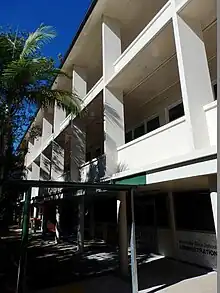 Modernist architecture developed in pre-World War I Europe and gained popularity in Australia after WWII. It is notable for a rationalisation of planning, emphasising clarity and simplicity of form and detailing.[58] Distinguished by their extensive use of steel, reinforced concrete and glass, Australian buildings in the modern or International style were heavily influenced by American and European examples. Characteristics included rectangular massing, plain smooth walls with areas of contrasting textures, and selective expression of structural systems, such as concrete framework. In Queensland, architects sought to create climatically responsive modernist buildings by combining careful building orientation, sun-shading devices and natural ventilation methods. This design approach was consistent with the requirements espoused by United Kingdom and New South Wales educationalists at the time, who advocated for schools that were climatically responsive with diffused natural light, and constructed of modern materials that were durable, washable and attractive.[59] Education in the 1950s was embracing the modern, and media reports at the time espoused the virtues of bright and attractive school buildings for encouraging student attendance, stating that "Brisbane's modern new State schools should make for happier, healthier learning".[60][1]