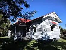 The Sectional School building at Moorooka was aligned approximately east–west, being lowset at the east end, and highset at the west end (due to sloping ground), and consisted of five classrooms 21 by 18 feet (6.4 by 5.5 m), with an 8-foot (2.4 m) northern verandah which wrapped around the east and west sides. A teachers room projected off the northern verandah, and the northeast and northwest verandah corners were enclosed.[20][21] The 1928 plan indicated possible future expansion through the addition of buildings off each corner of the first building, linked by their verandahs;[22] an expansion approach that accommodated the sloping site. The building (known as Block B in 2015) had a Dutch-gabled roof and was set on concrete piers. About two thirds of the understorey play area, on the west side, was floored with concrete. Three of the classrooms were linked by folding partitions, which could be opened to create an assembly hall. The remaining partitions were fixed, with centred doorways.[21] It was reported that there was room for 200 pupils, with ample light and ventilation provided by large windows on the southern side. The completed cost was £2,607.[23][1]