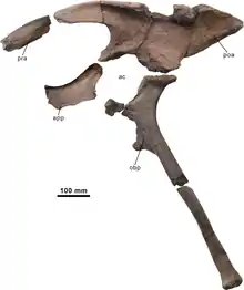 The holotype, CMP-MS-03, was found in a layer of the Arcillas de Morella Formation traditionally dated to the early Aptian, but according to recent palynological research perhaps dating from the late Barremian. It consists of a partial skeleton lacking the skull. It contains a right dentary tooth, seven dorsal vertebrae, fragments of the neural spines of dorsal vertebrae, two rib pieces, a sacrum, two chevrons, the ilia, incomplete pubes and ischia and a right tibia.[1]