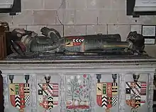 The church was patronised by the Corbet family and has an extraordinary Corbet family pew-room built into the south wall complete with a fireplace and carved seats on three sides. There is a number of monumental chest tombs of members of the family, such as that of Sir Richard Corbet (died 1566) and his wife Margaret.[12] Some of the monuments depict the deceased's children: one portrays 18 children and another has a single baby in swaddling clothes with rose and lily. There are tablets to two Corbets who died in different wars; a large marble plaque on the west wall to Captain Robert Walter Corbet, 49th Regiment, who died of fever at Marseille in 1855 during the Crimean War, the epitaph quoting his recorded last words Homme propose - Dieu dispose ('Man proposes, God disposes'), and another on the south wall to Captain Sir Roland Corbet, 5th Baronet, Coldstream Guards, who was wounded in the Retreat from Mons and died in France in 1915, in World War I. The latter's sword used to be displayed beneath the tablet but has been removed.[19]