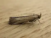 The wingspan is about 20 mm. Adults have dark brown forewings with various dark lines, each having a white mark near the base of the inner margin. The hindwings are off white, with narrow dark margins.[2]