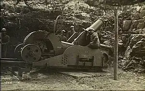 Since aircraft of the period were not yet capable of carrying large diameter bombs the burden of delivering heavy firepower fell on the artillery. The combatants scrambled to find anything that could fire a heavy shell and that meant emptying the fortresses and scouring the depots for guns held in reserve. It also meant converting coastal artillery and naval guns to siege guns by either giving them simple field carriages or mounting the larger pieces on rail carriages.[2]