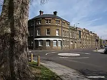 Mortlake was celebrated for its tapestry works in the early modern era.[1] The High Street provided the historic centre of the local area, only being overshadowed by the later development of East Sheen a little to the south as the formerly rural area was developed during the urbanisation of London. Mortlake Railway Station opened in 1846 to provide Mortlake with trains to Central London while Barnes Bridge railway station, a little to the east of the high street, opened in 1916 on the Hounslow Loop. The architecture of the street is a mixture of different periods, including Edwardian and later twentieth century apartments alongside buildings such as the Georgian Grade II listed house at 117 Mortlake High Street.[2]