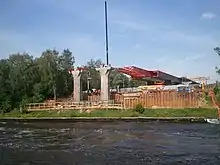 In December 2010, the Russian government decided to start the construction through Khimki Forest. Speaking in Saint Petersburg, Deputy Prime Minister Sergei Ivanov stated that new saplings would be planted on a territory of 500 hectares (1,200 acres) to compensate for the deforesting of about 100 hectares (250 acres) of the Khimki Forest.[18] On 29 September 2011, the construction of the Moscow–Solnechnogorsk section from 15 to 58 km (9.3 to 36.0 mi) began.[2]