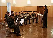 The school maintains a Marching Band (Russian: Марширующий оркестр) that is employed in ceremonial events hosted by the college, mostly made up of the musicians of the training band wing. The Suvorov College Band performs at the country's leading venues, including the Great Hall of the Moscow Conservatory, the Moscow International House of Music, and the State Kremlin Palace.[3] The central training band wing of the college plays not only in Russia, but also in military tattoo events in Switzerland, Germany, France, Italy, England, Poland, and the Czech Republic. It has been a regular participant in the Spasskaya Tower military tattoo festival since 2006.[4]
