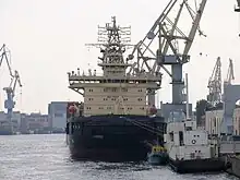 The keel laying ceremony of the first vessel was held on 19 May 2005[5] and the hull was launched on 25 May 2007, slightly behind the original schedule. At the time, technical readiness of the vessel was estimated to be 70 % and the delivery was still expected by the end of the year.[6] However, it took more than a year before the first new diesel-electric icebreaker was finally delivered to Rosmorport on 11 December 2008.[7]
