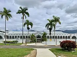 The Mossman Hospital is a complex of lowset buildings set on a level site on the western outskirts of Mossman. Cane fields and the Main Coast Range form a backdrop to the buildings which are set amongst spacious grounds of tended lawns and tropical gardens. A sweeping driveway, framed at access points by concrete formed gateways, approaches the main wing which is dominated by an extensive concrete facade with arched openings in the Spanish Mission style.[1]