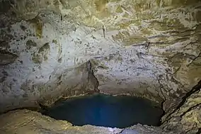 Motena Cave is a karst cave, formed in Askhi karst massif.[4] The total length of the cave is 75 m. It has two storey with big hall on each connected by a narrow passage. The first hall is 30 m in length and 24–25 m in height.[2] Cave is naturally decorated with many stalactites, stalagmites, travertine cascades and cave curtains.[5][6] Part of the cave has collapsed and mortared stone wall is protecting cave interior.[7]