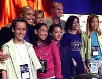 For the new generation of students, the producers chose from six hundred auditionees,[27] all of whom were children in an attempt to provide a group of characters that the target audience of teenagers could relate to, rather than actors in their twenties pretending to be teenagers, something other shows of the same period and target audience such as Buffy the Vampire Slayer and Dawson's Creek were doing.[8] Miriam McDonald first auditioned in October 2000 to play Emma Nelson, Spike's daughter, and was selected for the role after a callback and three screen tests.[29] Ryan Cooley appeared as J.T. Yorke, Jake Goldsbie as Toby Isaacs, and Cassie Steele as Manny Santos.[30] All signed their contracts just days before appearing at the CTV press conference.[6] Christina Schmidt appeared briefly as Terri McGreggor,[31] and Melissa McIntyre appeared in just one scene as Ashley Kerwin; she had no lines to speak in this episode.[32][33] Cassie Steele's sister, Alex Steele, made her first appearance as Angela Jeremiah, Joey's six-year-old daughter.[34] She returned with Mastroianni to the series at the beginning of season two to take on more permanent roles.[35]