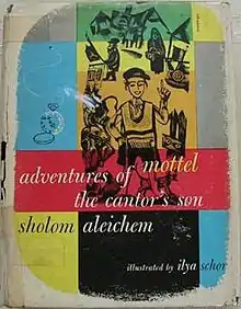 Motl, Peysi the Cantor's Son, subtitled The Writings of an Orphan Boy (מאָטל פּייסי דעם חזנס; כתבֿים פֿון אַ ייִנגל אַ יתום — motl peysi dem khazns; ksovim fun a yingl a yosem), is the last novel by the Yiddish author Sholem Aleichem, and unfinished at the time of his death. It was published in two separate volumes. The first was headed From Home to America (פֿון דער היים קיין אַמעריקע — fun der heym keyn amerike), relating the protagonist's experiences in Europe, and appearing in 1907. The second was headed In America (אין אַמעריקע — in amerike), chronicling his life in New York City, and written in 1916. They were printed on numerous occasions in various formats and with differing orthographic conventions. A critical edition of the Yiddish text was published in 1997.[1]