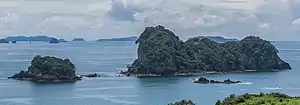 Motueka Island seen from the Coromandel Peninsula, adjacent to Poikeke Island to the left