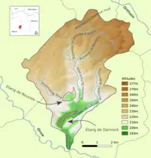In the 13th century,[11] Benedictine monks built an artificial pond using dikes and canals to adapt to natural and geological formations. The mill dike closed off the outlet from the lowland and raised the water level. At the beginning of the 19th century, the pond covered almost 43 hectares and captured water from the Ruisseau de Rosa[12] and part of the watershed of the Ru du Moulin de Darmont.[13] The excess water flowed into the Moulin de Darmont stream below,[14] then into the Orne, a tributary of the Moselle and a sub-tributary of the Rhine. At the same time, a second, smaller pond was created by diverting water from the Ruisseau de Rosa.