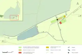 The Rouvres mill lies at the southern end of the Dalle d'Étain, an Upper Bathonian marl-limestone tabular outcrop found only in north-western Lorraine.[1] This layer is located in a transition zone between the clayey depression of the Woëvre plain (to the west) and the limestone plateau of the Pays Haut des Côtes de Moselle (to the east).[2] The oolitic limestones of the Étain slab are much more solid than the other limestone layers of the Meuse region, and are joined at the surface by rhynchonella marl.[3] The quality of this rock favored the development of a major extraction activity that contributed to the economic dynamism of the areas around the mill during the Middle Ages.[4] Near Rouvres-en-Woêvre,[5] the deposits reach depths of up to sixteen meters.[6] A rectangular pit containing three complete vases dating from the Bronze Age was unearthed a few hundred meters from the mill.[7] This discovery attests to the presence of this type of activity as early as 1200 to 900 BC.[8]