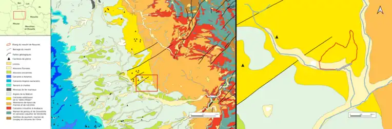 The development of the mill pond was made possible by a specific geological layout, due to the presence of impermeable soils held back by a very concentrated clay elevation created by contact with the Pays Haut limestone plateau. In contrast to the entire band to the east of the Étain slab, the transition between oolitic limestone and marly limestone is less clear-cut at mill level, due to the presence of marly elements on the lateral bands, joined at the surface by silt deposits.[6] This arrangement favored the formation of a depression where water stagnation facilitated the development of a marshy area that was later converted into a pond.[10]
