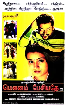 Mounam Pesiyadhe (transl.Silence spoke) is a 2002 Indian Tamil-language romantic drama film, written and directed by Ameer in his directorial debut. It stars Suriya and Trisha in the lead along with newcomers Nandha, Neha Pendse and choreographer-turned-actor Anju Mahendra in supporting roles along with several other newcomers, while Laila appears in a cameo role during the climax. It also marks the first film for Trisha as lead actress after playing a cameo role in Jodi (1999). The major part of the film is shot in Pondicherry. The film, released on 13 December 2002 and turned out to be a hit at the box office. It was remade in Telugu as Aadanthe Ado Type (2003)[1] and later dubbed in the same language as Kaanchu (2006).[2]
