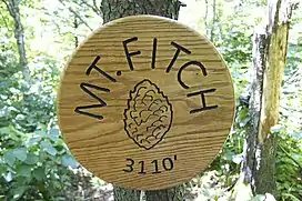 Mount Fitch is the third-highest peak[1] in the Commonwealth of Massachusetts at 3,110 feet (950 m). It is located on the ridge between Mount Greylock at 3,491 feet (1,064 m) to its south and Mount Williams at 2,956 feet (901 m) to its north. The peak sits in the northwest corner of the Town of Adams (originally known as the Town of East Hoosac[2]) in Berkshire County. The forested summit is approximately 123 yards (112 m) due west of a local high-point on the Appalachian Trail. Mount Fitch does not meet the Appalachian Mountain Club's prominence criterion of 200 vertical feet of separation from adjacent peaks as outlined in New England's Four-thousand footers list. Currently there is no side-spur trail or signage directing a hiker to the summit of Mt. Fitch from the Appalachian Trail; however, there is a wooden placard at the summit itself (pictured at right). The top is infrequently visited by hikers due to its anonymity, the bushwhack necessary to reach the top and the viewless summit.