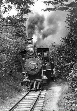 The Gilded Age iron industrialist and railroad president Robert Habersham Coleman decided that a 4-mile (6-kilometer) narrow-gauge railroad to the top of nearby Governor Dick Mountain would provide an additional tourist draw, and a 0.6-mile (1-kilometer) spur at milepost 0.75 could service the Pennsylvania National Guard rifle ranges nearby.[1] The line was built to the rare (in North America) and very narrow gauge of 24 inches (610 mm). Locomotives, apart from an early and unsuccessful H. K. Porter, Inc[2] 0-4-4T Forney locomotive, were three 4-4-0 "American" types (#11, #12 and #15)[3] built by Baldwin Locomotive Works. Locomotive #12 was ordered on 22 June 1889 and built in only 8 days to be ready for anticipated Independence Day crowds after the Porter Forney wheelbase proved too rigid for reliable service on small-radius curves. The Baldwin locomotives featured lagged smokeboxes[3] and were the only 2 ft (610 mm) gauge 4-4-0s ever operated in North America; although Baldwin built a 600 mm (1 ft 11+5⁄8 in) gauge 4-4-0 for the Ferrocarril de Tacubaya of Mexico City in 1897.[4][5]