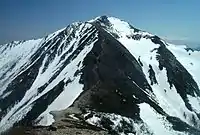 Mount Jōnen (常念岳, Jōnen-dake) is one of the 100 Famous Japanese Mountains,[3] reaching the height of 2,857 m (9,373 ft).[1] It is situated in Japan's Hida Mountains in Nagano Prefecture and in Chūbu-Sangaku National Park.[4] The shape of the mountain looks like the triangle. It can be seen from Azumi Basin.