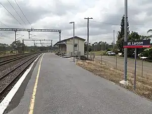 Mount Larcom railway station is located on the North Coast line in Queensland, Australia. It serves the town of Mount Larcom. It features a single platform with a wooden structure. Opposite lie two passing loops.