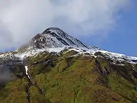 McGinnis Mountain, also known as Mount McGinnis, is a 4,232-foot (1,290 m) mountain summit located in the Boundary Ranges, in the U.S. state of Alaska.[4] The peak is situated near the toe of the Mendenhall Glacier, within Tongass National Forest, 11 mi (18 km) north-northwest of Juneau, Alaska, and 6 mi (10 km) north of Juneau International Airport. Although modest in elevation, relief is significant since the mountain rises up from sea level at Auke Bay in less than five miles. McGinnis Mountain is often seen and photographed with Stroller White Mountain, a 5,118-foot (1,560 m) summit 1.6 mi (3 km) to the north because they are together in the background behind Mendenhall Lake, a popular tourist and recreation area.