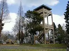 A four-story observation deck, a prefectural park and camp grounds are located on top of the mountain.[1] The park has an area of 15 km2 (6 sq mi).[1] There are no other tall mountains nearby, so many visitors come to the park at night because the observation deck offers a good view of the surrounding Nōbi Plain. The summit can be reached by car and is about 3 km (1.9 mi) from Route 363. A small road through the forest begins in the city of Toyota.