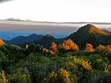 There are numerous tracks to the summit.[17] All the tracks are well signposted, with bright orange plastic waymarks[18] and near the summit have recently been laid with boardwalks (see photo below), some of them as part of Te Araroa long distance trail.[19] A lookout platform was built on Pirongia summit after 1999.[6] From it, it is possible to spot Mount Taranaki summit and Mount Ruapehu summit on a clear day (see sunset photo). On the west side there are Aotea, Kawhia and Raglan harbours.[18]