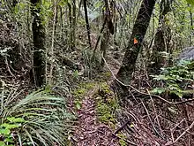 - Mahaukura - Tirohanga Circuit (8–11 hours 12 km (7.5 mi) return) (4–6 hr / 9 km (5.6 mi) one way) is a longer distance but with a gradual climb from Grey Road. This track is considered difficult. It leads through many steep sections but gives excellent views from Wharauroa lookout (850 m (2,790 ft)), the last 30 m (98 ft) to it having a fixed chain to assist climbing, Mahaukura peak (899 m (2,949 ft)) and Tirohanga peak. In winter and after rain the track becomes muddy and slippery. There are many narrow sections with a tangle of tree roots and rocks.[20]
