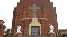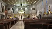 By 1929, St. Peter was crowded for all three Masses on Sunday morning. There were so many people that the balcony, the sanctuary, and both sacristies were opened seating. Eventually the priests opened the doors of the church and hundreds of people stood outside on the steps to hear the Mass. Despite all of these accommodations, there were still many people who were turned away because there was not enough space to accommodate them. There were about a thousand families who belonged to St. Peter parish, but the church itself only had about two hundred seats in the pews. In 1933, Bishop Hugh Boyle suggested the construction of a larger church and the congregation decided to construct a larger building.[15] The new church building was constructed by the parishioners, who broke ground in May 1941 and three years later dedicated the new building.