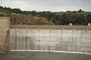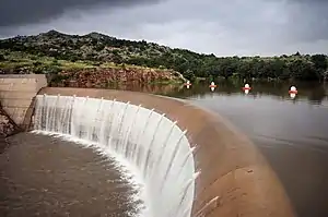 The concrete arch portion of Mountain Park Dam functions as an uncontrolled, overflow spillway. The crest is at the top of the exclusive flood control pool at elevation 1,414.0, and is 320 feet (98 m) long measured along the axis of the dam. Concrete piers and training walls at each end of the spillway direct floodwater into and over the crest. Floodwaters fall into a plunge pool energy dissipater at the toe of the dam. The spillway is designed for a maximum discharge of 38,300 cubic feet (1,080 m3) per second with the reservoir at elevation 1,423.6 feet (433.9 m).