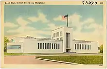 Beall High School was established in the mid-1890s as the first high school of Frostburg. The first Beall High School was located at the corner of Loo Street (now College Avenue) and Broadway, where Beall Elementary School stands today. The first graduating class consisted of six female graduates in 1897. The original building was renovated in 1910, and expanded in 1930. By the late 1930s, the Frostburg community was in dire need of a much larger, newer facility. In 1939, ground was broken for a new Beall High School, located at 331 E. Main Street, in an area locally known as the "Eckhart Flat." The newer building is the one that most graduates and citizens of Frostburg are familiar with. It was considered an architectural wonder of its time with its Art Deco styling.[3]