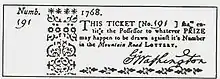 George Washington's diaries contain several entries concerning Captain Bullitt and the sale and distribution of the Warm Springs Mountain Road Lottery tickets. One notable credit entry dated January 1, 1770, remarks "Tickets that it is presumed will not be sold - but are not yet returned."[1] Advertisements for the lottery were placed in The Virginia Gazette that offered 6,000 tickets to be sold at one pound each. 85% of the money was to be paid out in the form of prizes, and the remainder kept for the project. Unlike today's lotteries, people would not accept the lottery sponsors making large profits.