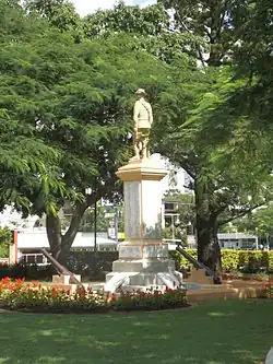 In 1916–17, the earliest First World War Memorial in Brisbane, an honour roll and statue honouring all soldiers, sailors and nurses who had enlisted for active service from the 8C (East Brisbane and Kangaroo Point) Training Area, was erected at Mowbray Park by local residents. A public subscription was raised by the East Brisbane Cadet Committee, and the tender of £187/10/- from W Batstone & Sons, monumental masons of Annerley Road, was accepted in March 1916. The "digger" statue, a rare Queensland representation of an Australian Light Horseman, was carved by Alfred Batstone. The foundation stone was laid on 4 November 1916,[3][4] on the brow of the hill near Lytton Road, with views of both the Shafston and Humbug reaches of the Brisbane River, and the memorial was unveiled by Lady Goold-Adams, wife of Queensland Governor Hamilton Goold-Adams, on 11 August 1917.[5][6] It was flanked by two cannons, reputedly part of Thursday Island's 19th century defences, and was surrounded by a garden in the shape of a cross. Additional honour rolls were added during and after the war. A metal railing fence around the memorial had been constructed by 1925, but this was replaced with stone kerbing in 1929, with stone recycled from the old Normal School in Adelaide Street, which was being demolished to make way for Brisbane's Anzac Square.[1]