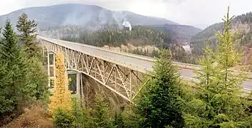 The ruins of the 1923 version of the dam, the Old Eileen Dam 48°46′32″N 116°09′19″W / 48.77550°N 116.15514°W, stands five miles upstream. It's noted as one of the few concrete single-angle thin-arch dams to be breached, although it was not a structural failure. A sudden flood in 1925 overtopped the 52-foot (16 m) dam, washed out the left embankment, and left the dam shell intact.[4][5] There were no casualties. The shell and rusting powerhouse equipment remain, posing an obstacle, and mystery, for white-water rafters.[6][7]