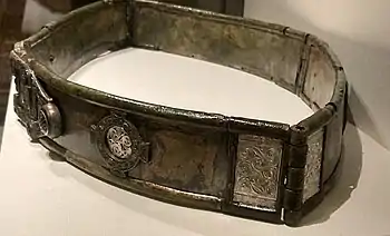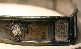 The Moylough Belt-Shrine is a highly decorated 8th-century Irish reliquary shaped in the form of a belt. It consists of four hinged bronze segments, each forming cavities that hold strips of plain leather assumed to have once been a girdle belonging to a saint and thus the intended relic.[2] It remains the only known relic container created as a belt-shrine,[3] although such objects are mentioned in some lives of Irish saints, where they are attributed with "remarkable cures", and there are surviving reliquary buckles in continental Europe. The belt may have been influenced by 7th-century Frankish and Burgundian types.