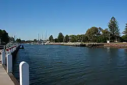 The mouth of the river has been significantly altered. The river originally spilled into the Bass Strait, south of the town of Port Fairy, through a series of narrow channels that led westward from the site of the present-day mouth. At that stage, the southern outlet of the Moyne, the Back Passage, was narrow and the opening to the sea was often too rough for boats to leave or enter the port; the main eastern outlet was blocked by a shallow sand bar. These navigational impediments led to the construction of a jetty from Flagstaff Hill and a boulder wall breakwater between Griffiths Island and Rabbit Island. Training walls constructed in the 1870s curve from the northern part of Griffiths Island through the sand bar. These structures rapidly led to the accumulation of large amounts of sand on the north coast of Griffiths Island and back shore erosion north of the breakwaters. A protective stone wall was added in 1911.[1]