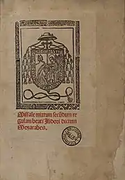 The first printed Mozarabic missal, the Missale Mixtum secundum regulam beati Isidori, appeared in 1500, followed two years later by a breviary (the Breviarium secundum regulam beati Isidori). The preparation of the missal's text was the work of canon Alfonso Ortiz, who had already begun work on Mozarabic codices under Cisneros' predecessor Cardinal Mendoza, and three Mozarabic priests: Alfonso Martinez Yepes (Santa Eulalia), Antonio Rodrigues (Santas Justa y Rufina), and Jeronimo Gutiérrez (San Lucas).[9][20][21]