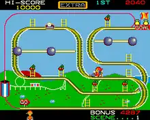 Mr. Do!'s scenario is a roller coaster, and the object is to reach the top. As the cars (and eventually other objects) speed around the track, the player must escape by using a super speed button, or by climbing up small ladders scattered about the track to dodge the hazards. Two icons at the end of the level range from cakes to EXTRA letters or diamonds change upon collecting cherries at the top of each letter. The game is timed, and the timer ticks faster when the super speed button is held down. Collision with a roller coaster car or another object is fatal, knocking Mr. Do! off the coaster and costing a life.