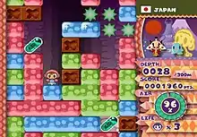 Mr. Driller W is a puzzle video game. It features gameplay reminiscent of the Dig Dug series, being presented in a colorful, 2D style.[1][2] Players control one of seven characters as they must make their way to the bottom of each level, all of which take place in real-world locations such as Japan, Egypt, and even the moon.[3] The seven characters include Susumu Hori, the main protagonist of the series; Anna Hottenmeyer, a German driller and rival of Susumu; Ataru Hori, Susumu's outcast older brother; Taizo Hori, the protagonist of Dig Dug and the father of Susumu and Ataru; Puchi, Susumu's pet dog; Holinger-Z, a drilling robot; and Usagi, Atari's pet rabbit-like alien who is locked from the start.[2][3] Each character possesses their own unique abilities; for instance, Holinger-Z can sustain an extra hit, essentially doubling the player's life count.[2][3] The gameplay revolves around destroying, or "drilling", colorful formations of blocks that litter the playfield. The player has a constantly-depleting oxygen meter, which acts as a time limit;[2] oxygen can be replenished by collecting air capsules found throughout the level, while oxygen is lost by destroying brown-colored "X" blocks.[3]